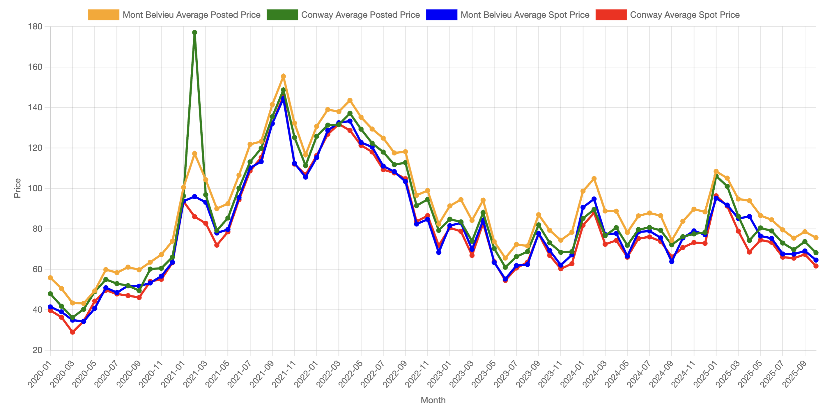 Conway spots opened mid-October at 67 cents/gal. The next week the price remained flat, followed by a 0.5-cent increase to 67.5 cents the next week. Prices then decreased 2.75 cents to 64.75 cents/gal the first week of October. At mid-month, they decreased 3.5 cents to 61.25 cents/gal. Compared to the same time in October 2024, the October 2025 prices were 11.25 cents lower.